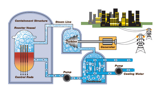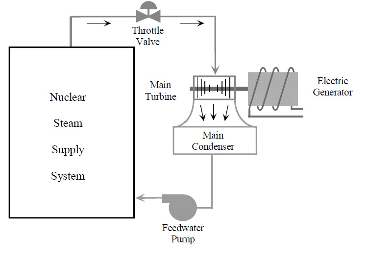 Lalu bagaimana halnya dengan reaktor nuklir atau PLTN? PLTN yang beroperasi saat ini sebagian besar juga bekerja berdasarkan proses siklus Rankine. Oleh karena itu secara garis besar prinsip pembangkitan listriknya juga mirip dengan PLTU. Akan tetapi bedanya, bahan bakarnya diganti dengan bahan bakar nuklir. Proses terbentuknya energi tidak berada di tungku, melainkan di teras reaktor. Gambar 2 di bawah ini menampilkan skema kerja PLTN.