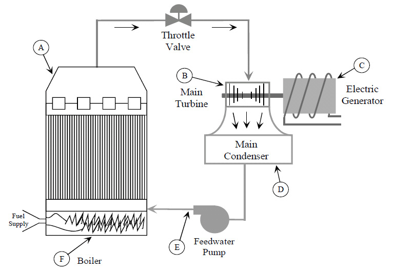 Batubara yang merupakan bahan bakar dipasok ke dalam tungku (furnace). Di situ batubara dibakar dan akan menghasilkan energi atau kalor. Selanjutnya energi tersebut akan dipindahkan ke air di dalam boiler (F), di mana air kemudian akan mendidih dan berubah bentuk menjadi uap (A). Uap yang mempunyai suhu tinggi dan tekanan tinggi ini akan dialirkan ke turbin (B). Di dalam turbin, uap akan melewati sudu-sudu turbin yang kemudian akan memutar poros untuk menggerakkan generator (C) dan menghasilkan listrik. Uap yang telah melewati turbin selanjutnya akan masuk ke dalam kondensor (D), di mana uap tersebut akan didinginkan dan berubah bentuknya kembali menjadi cair. Air dari kondenser selanjutnya akan dikembalikan ke dalam boiler dengan menggunakan pompa umpan (E). Demikian seterusnya proses tersebut berlangsung berulang-ulang. Karena proses tersebut berulang dan menggunakan uap sebagai media untuk memindahkan energi, maka proses ini disebut dengan istilah siklus uap atau dikenal juga dengan istilah siklus Rankine.
