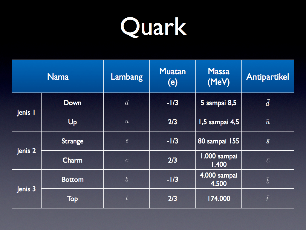 Keluarga kedua dari partikel elementer adalah quark yang terdiri dari 6 anggota (atau kalau dalam istilah fisika dikenal dengan “rasa”), yaitu up, down, strange, charm, bottom dan top. Tabel 2 di bawah menampilkan informasi singkat mengenai quark.