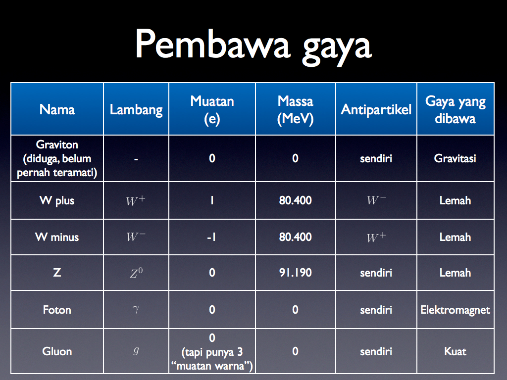 Tabel tersebut diurutkan berdasarkan kekuatannya. Tampak bahwa gaya gravitasi akan dibawa oleh partikel yang disebut graviton. Akan tetapi sampai saat ini partikel tersebut belum dapat diamati secara pasti. Kemudian juga ada tiga partikel yang membawa gaya lemah, yaitu partikel W plus, W minus dan Z. Kemudian partikel yang sering kita jumpai adalah foton, dan ternyata foton ini merupakan partikel pembawa gaya elektromagnet. Yang terakhir, partikel pembawa gaya kuat adalah gluon, seperti yang telah disinggung di atas. Ada 8 jenis gluon dan masing-masing gluon membawa muatan “warna”, meskipun muatan listriknya netral.