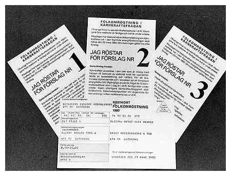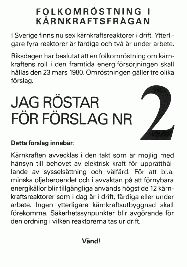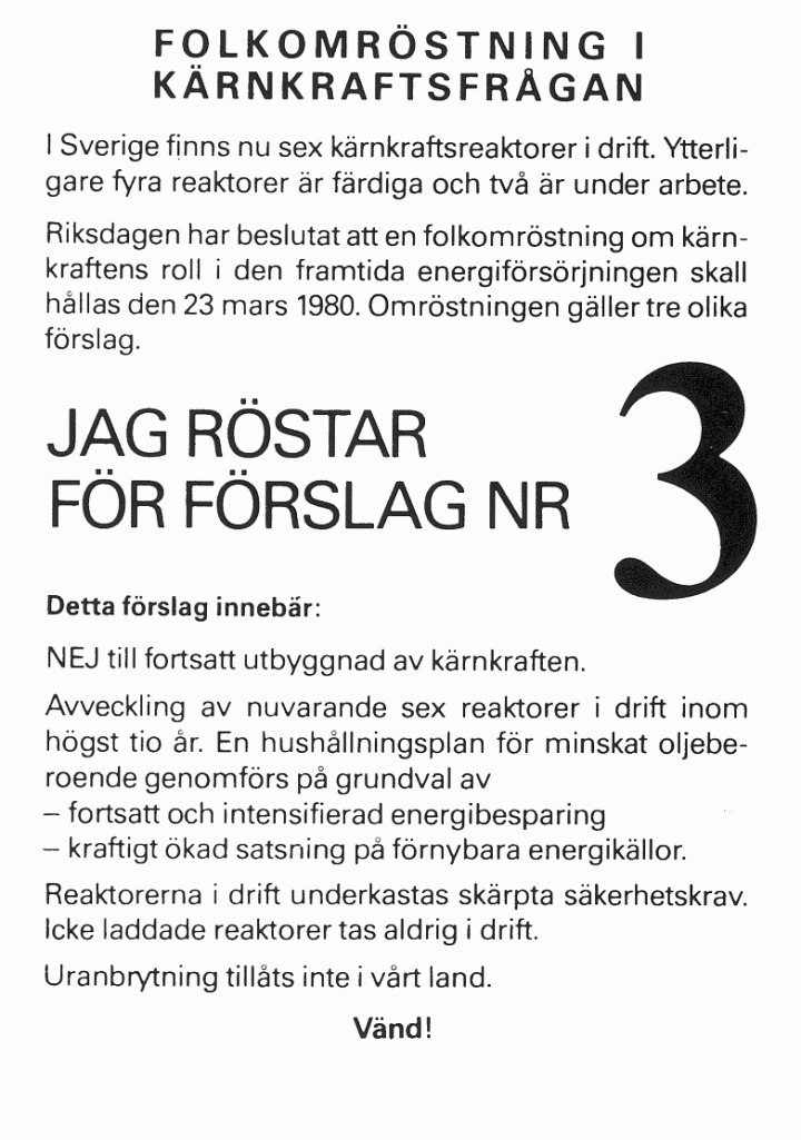 Setelah terjadi kecelakaan di Three Miles Island 3 pada tahun 1979, Swedia mengadakan referendum tentang masa depan energi nuklir. Referendum tersebut diselenggarakan pada tanggal 23 Maret 1980. Terdapat tiga opsi (atau istilahnya linje) yang harus dipilih oleh rakyat. Opsi-opsi tersebut dirumuskan oleh partai-partai politik di parlemen. Dari sudut pandang demokrasi, referendum ini patut dipertanyakan. Mengapa? Karena ketiga opsi yang ada mengarah kepada penolakan energi nuklir, dan tidak ada opsi bagi orang yang menginginkan berlanjutnya energi nuklir di Swedia.