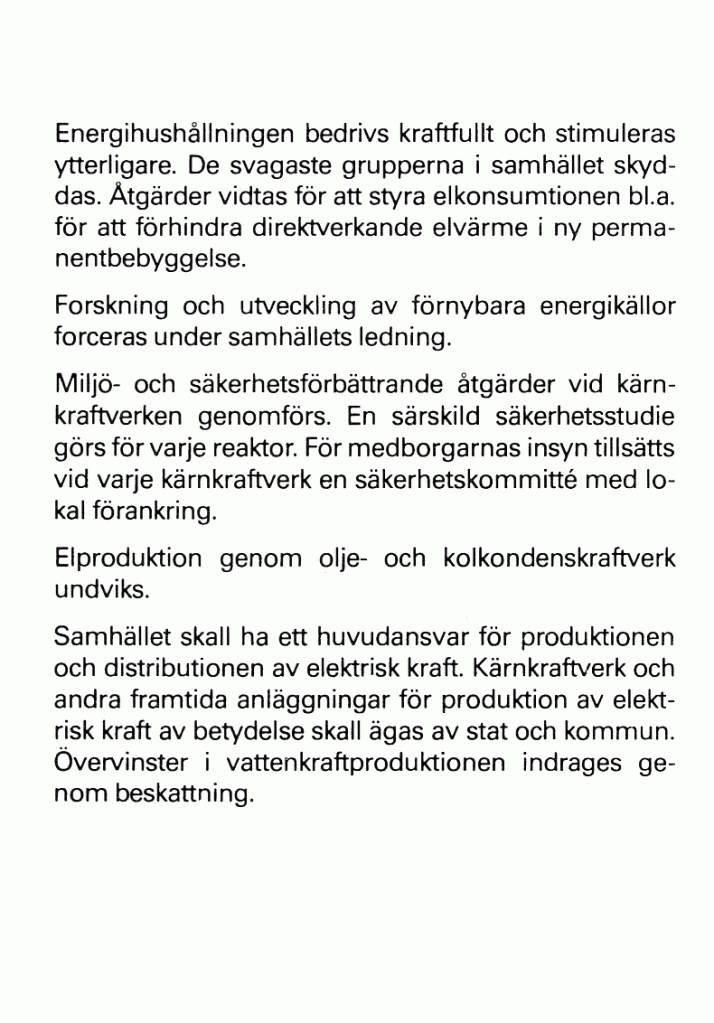 Konservasi energi akan dikejar sepenuhnya dan dirangsang lebih lanjut. Kelompok-kelompok paling lemah di masyarakat akan dilindungi. Langkah-langkah untuk mengatur konsumsi listrik akan diambil, misalnya dengan melarang penggunaan pemanas listrik langsung dalam pembangunan rumah permanen baru.