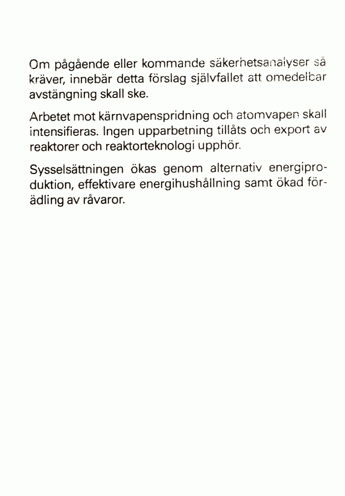 PLTN akan ditutup (phase out) secepat mungkin dengan mempertimbangkan perlunya tenaga listrik untuk mempertahankan lapangan kerja dan kesejahteraan. Untuk mengurangi ketergantungan terhadap minyak dan sambil menunggu tersedianya sumber energi terbarukan, maka maksimum 12 reaktor digunakan baik itu yang saat ini sedang beroperasi, selesai dibangun maupun sedang dibangun. Tidak ada ekspansi energi nuklir lebih lanjut. Urutan reaktor yang akan ditutup ditentukan berdasar aspek keselamatan.