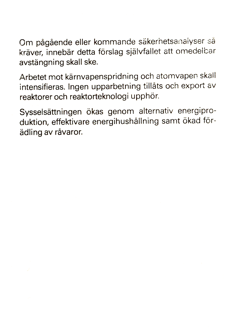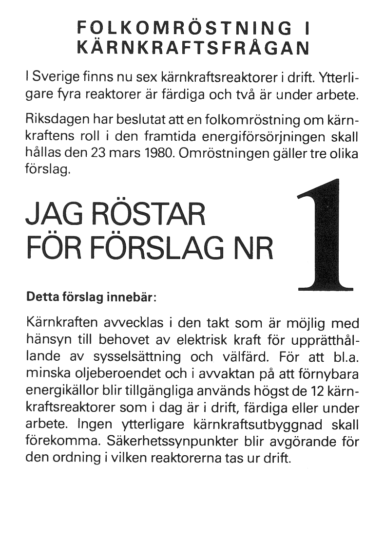 Setelah terjadi kecelakaan di Three Miles Island 3 pada tahun 1979, Swedia mengadakan referendum tentang masa depan energi nuklir. Referendum tersebut diselenggarakan pada tanggal 23 Maret 1980. Terdapat tiga opsi (atau istilahnya linje) yang harus dipilih oleh rakyat. Opsi-opsi tersebut dirumuskan oleh partai-partai politik di parlemen. Dari sudut pandang demokrasi, referendum ini patut dipertanyakan. Mengapa? Karena ketiga opsi yang ada mengarah kepada penolakan energi nuklir, dan tidak ada opsi bagi orang yang menginginkan berlanjutnya energi nuklir di Swedia.